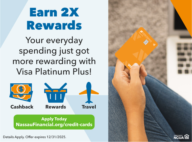 *APR = Annual Percentage Rate. Rate shown requires Direct Deposit OR AutoPay. Minimum line of credit $500; maximum line of credit $40,000. 1Get 1.75% APR fixed for the first 12 months, then the prevailing rate, which is variable and based on the Wall Street Journal Prime Rate plus a margin, based on creditworthiness, on the last business day of the month with a cap of 17.9%. 2Get 0% APR on all balance transfers for the first 18 months, then the prevailing rate. A 4.99% fee applies to all balance transfers. Minimum balance transfer is $1,000. All loan applications underwritten based on creditworthiness and other criteria. Nassau Financial’s cumulative unsecured loan &/or line of credit limit maximum is $40,000. rate offers subject to change without notice.